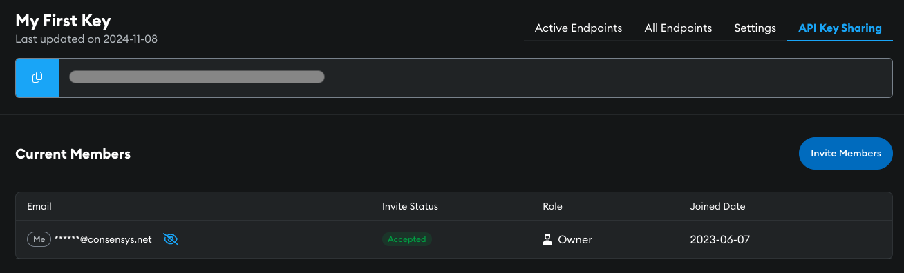 You can share access to your Infura API keys by inviting existing Infura account members.